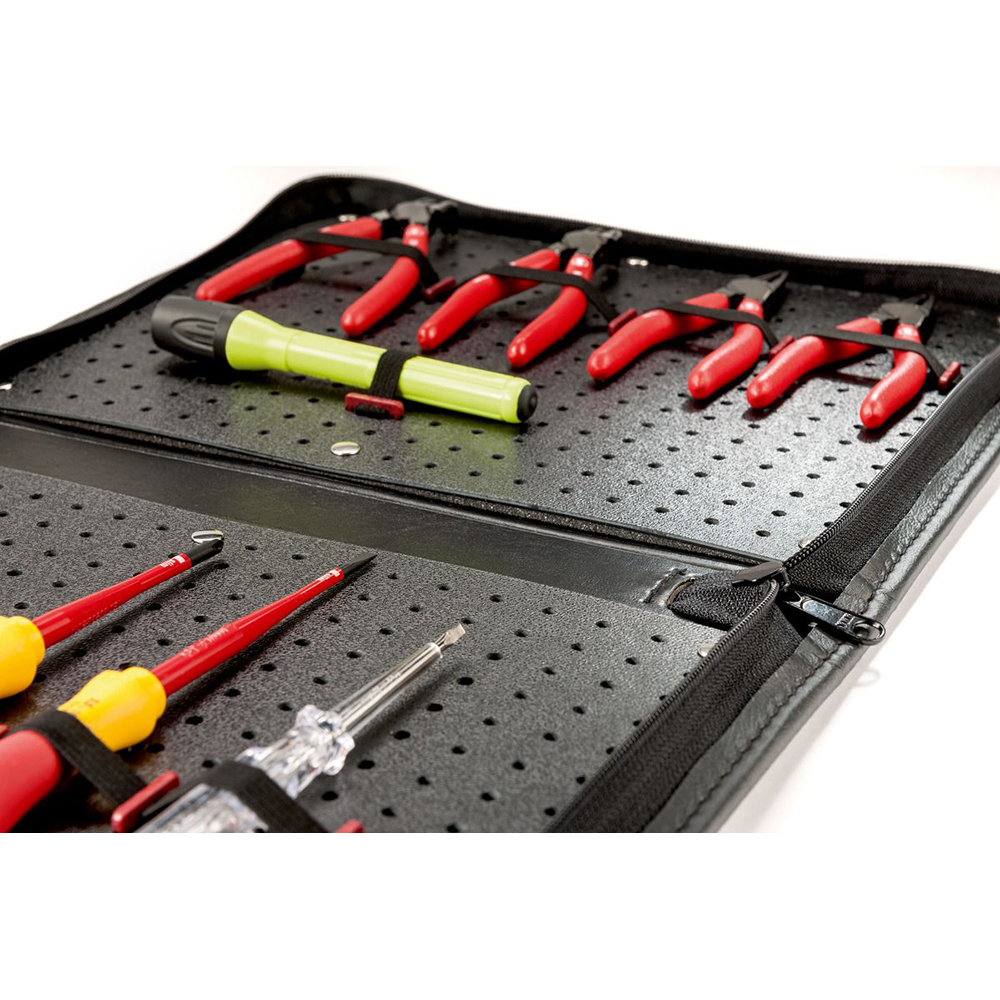 This Parat Basic Portfolio Case mainly impresses with its understated elegance. It is made of black artificial leather and has an empty weight of approx. 1,200 g. The tool case can be transported easily and smoothly. This handy case is closed with a sturdy and carefully worked out zipper. The tool case contains two perforated boards including 20 band clamps and 1 m elastic band including assembling aid. This way, all tools can be fixed safely in the wallet and also enable showcasing based on your personal wishes. In addition, this sturdy presentation wallet provides a separate pocket for business cards outside, so that they are always within reach. A tool case with which you’ll convince your customers or perform perfectly during product presentations.