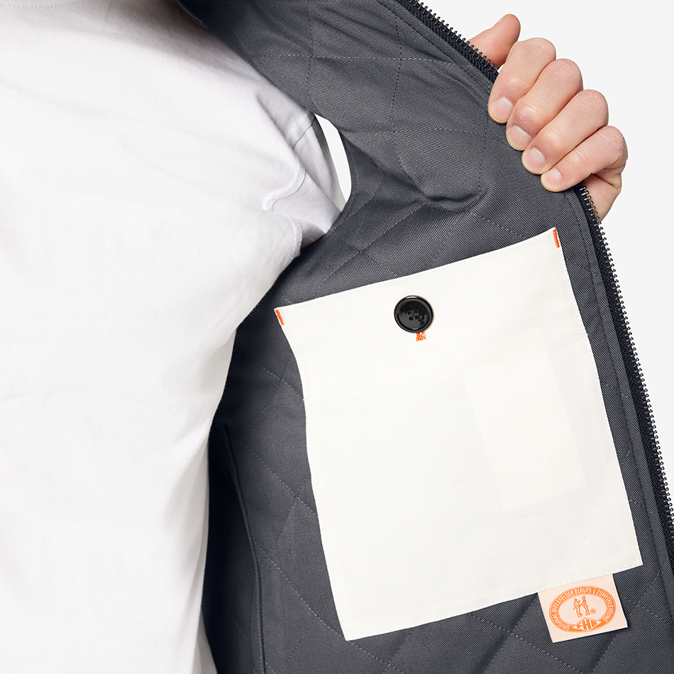 Practical storage includes large kangaroo-style front pockets with wide openings, an integrated zip pocket on the front right side, and a natural-colored inside pocket with button closure. A historic FHB woven label inside adds a subtle nod to the brand’s heritage.