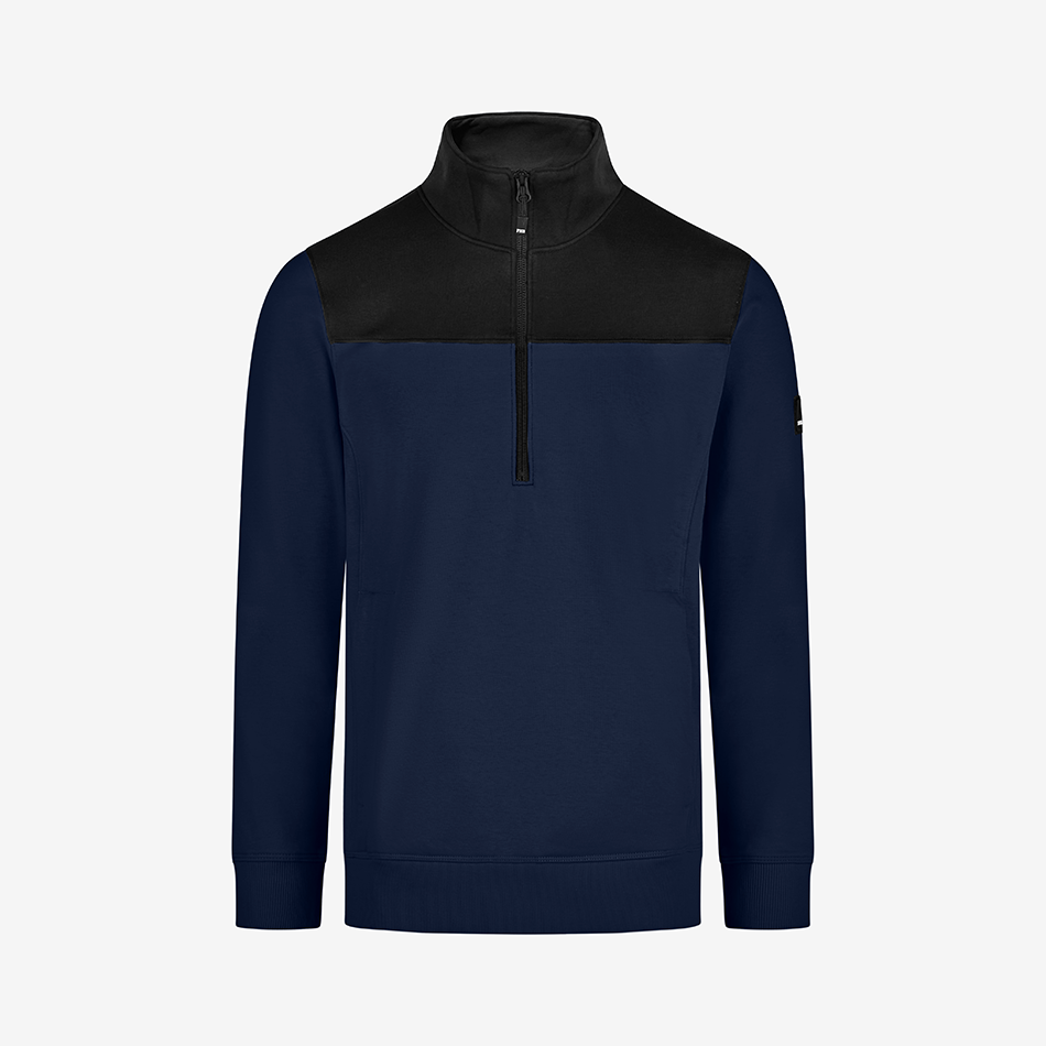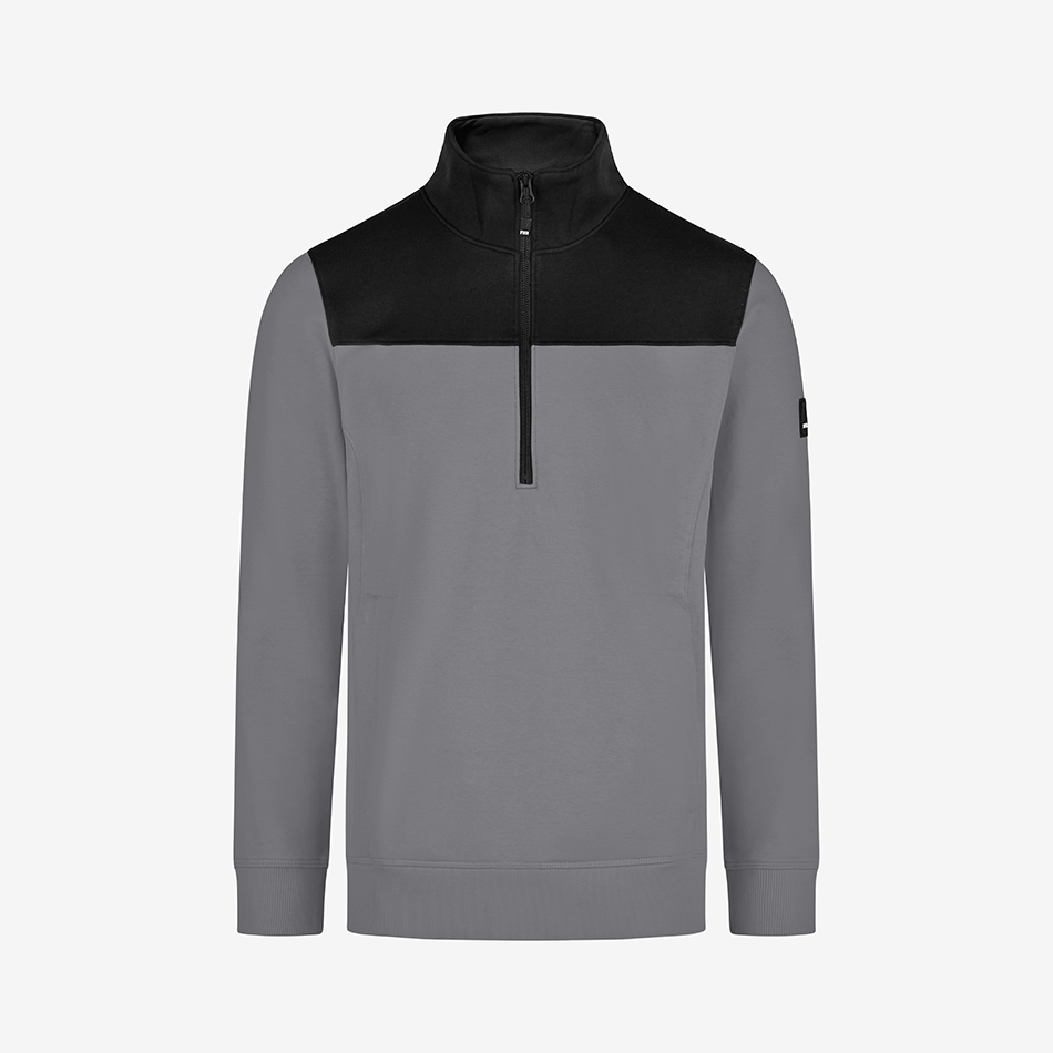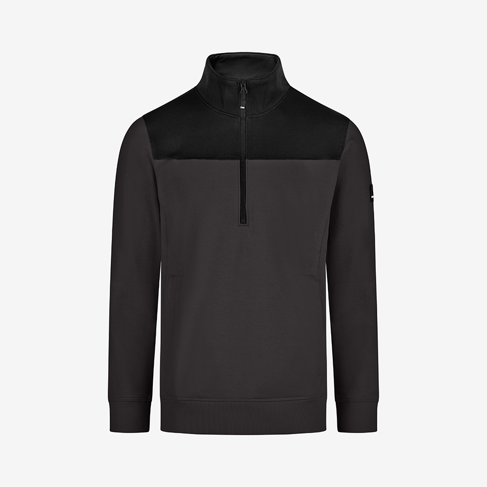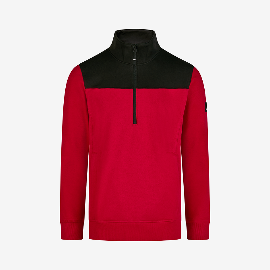 FHB zip-up sweater “Rob” is made out of a soft cotton jersey blend with a french terry inside (special loop structure) and has a light and comfortable fit. The sweater has a YKK front zipper offering a deep neckline for easy in and out. It also has a 450g/sqm heavy rib-knit hem and cuffs, as well as 2 well-integrated side pockets with a concealed zipper.