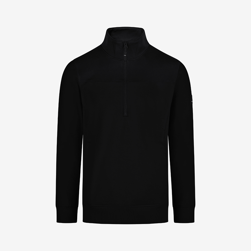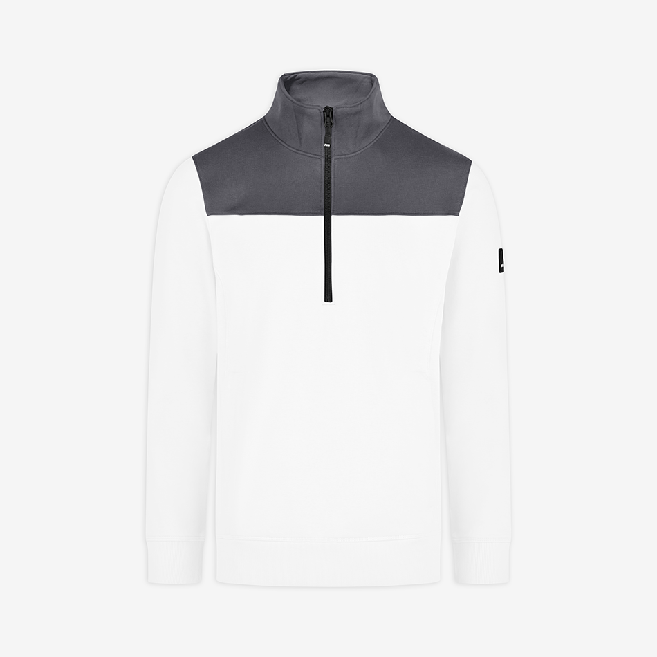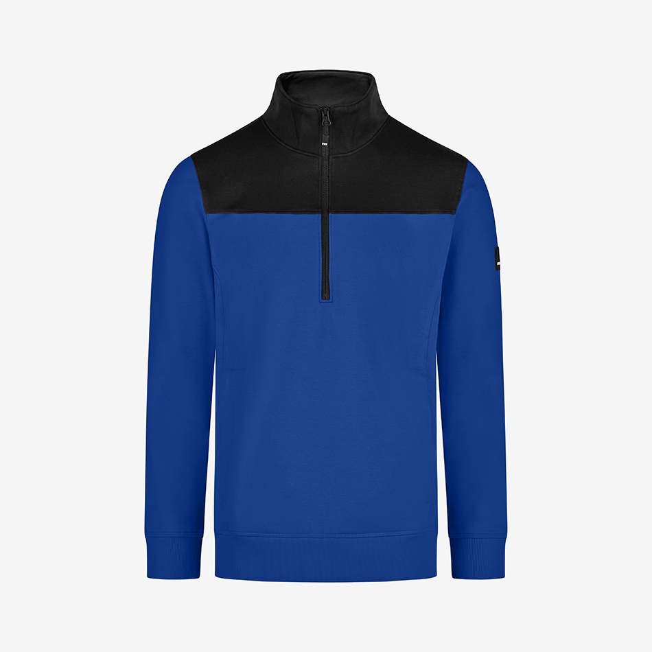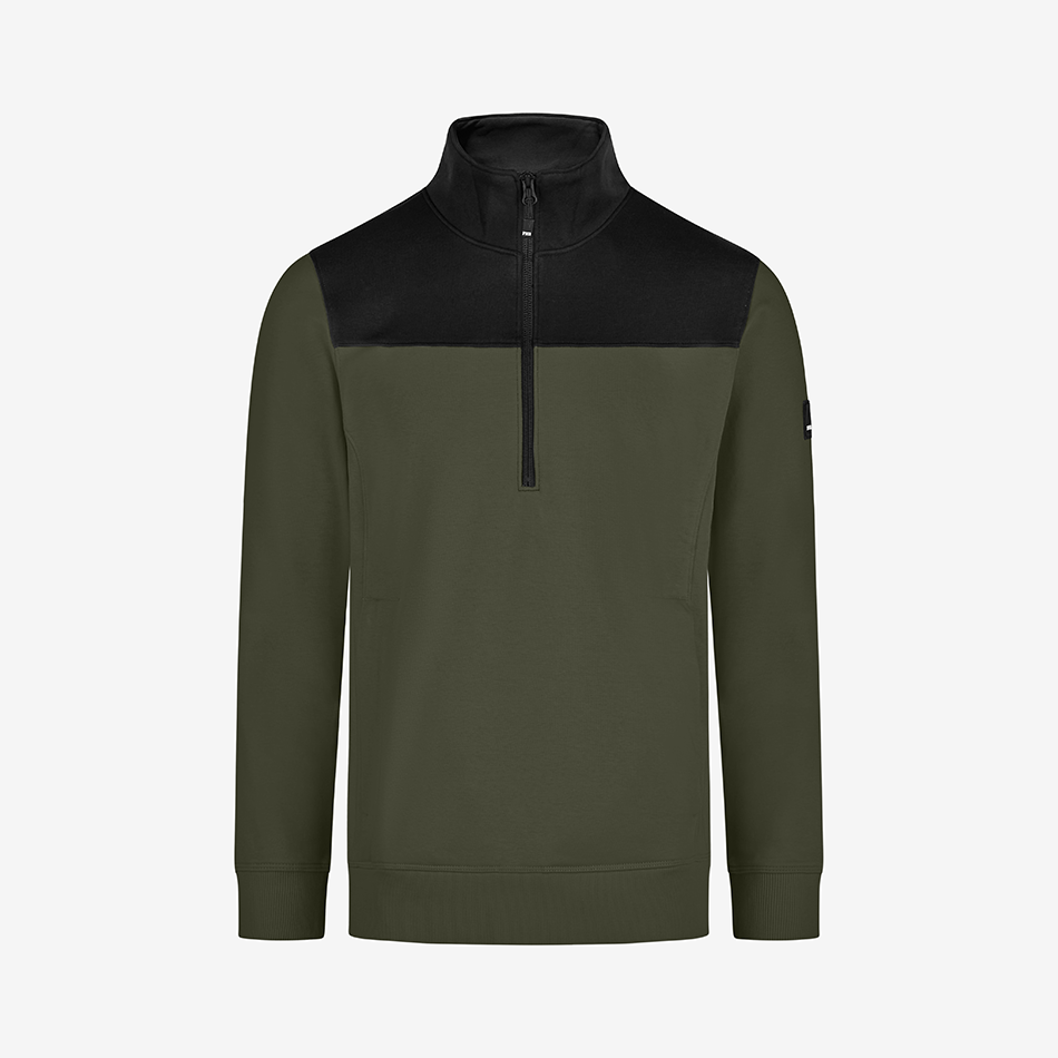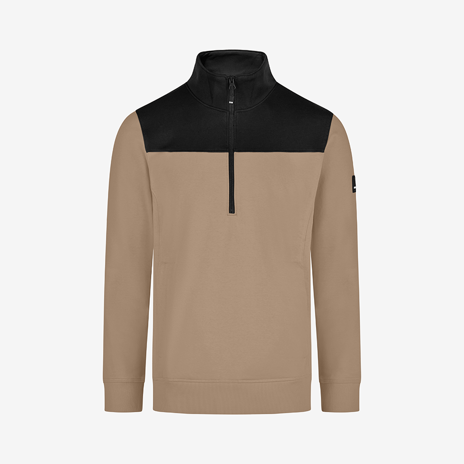 FHB zip-up sweater “Rob” is made out of a soft cotton jersey blend with a french terry inside (special loop structure) and has a light and comfortable fit. The sweater has a YKK front zipper offering a deep neckline for easy in and out. It also has a 450g/sqm heavy rib-knit hem and cuffs, as well as 2 well-integrated side pockets with a concealed zipper.