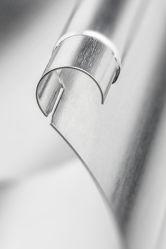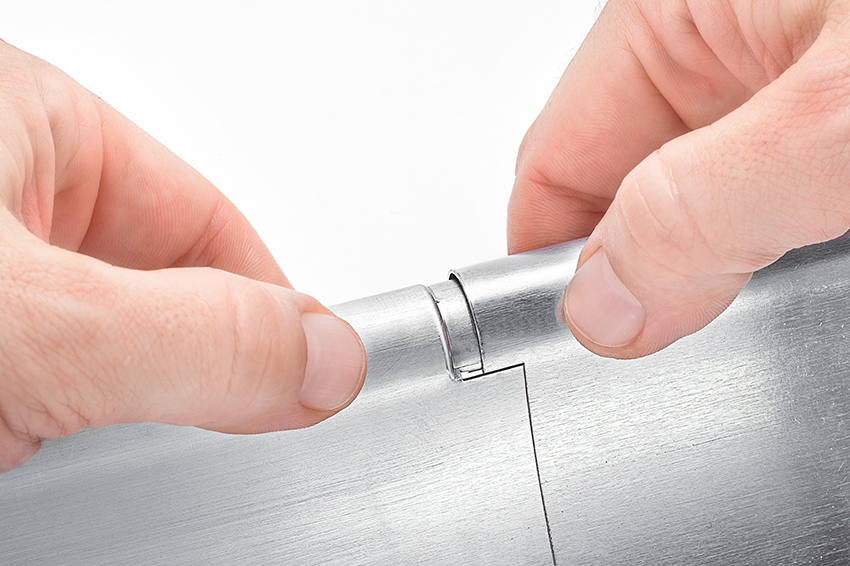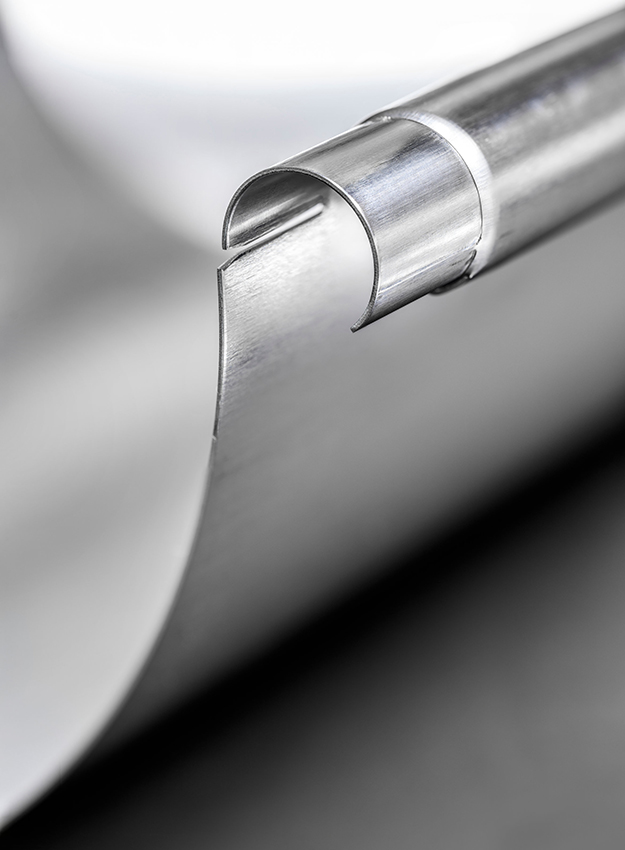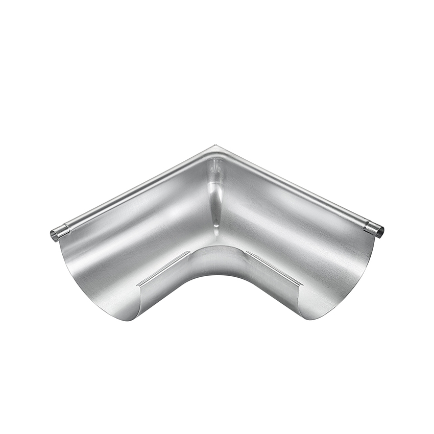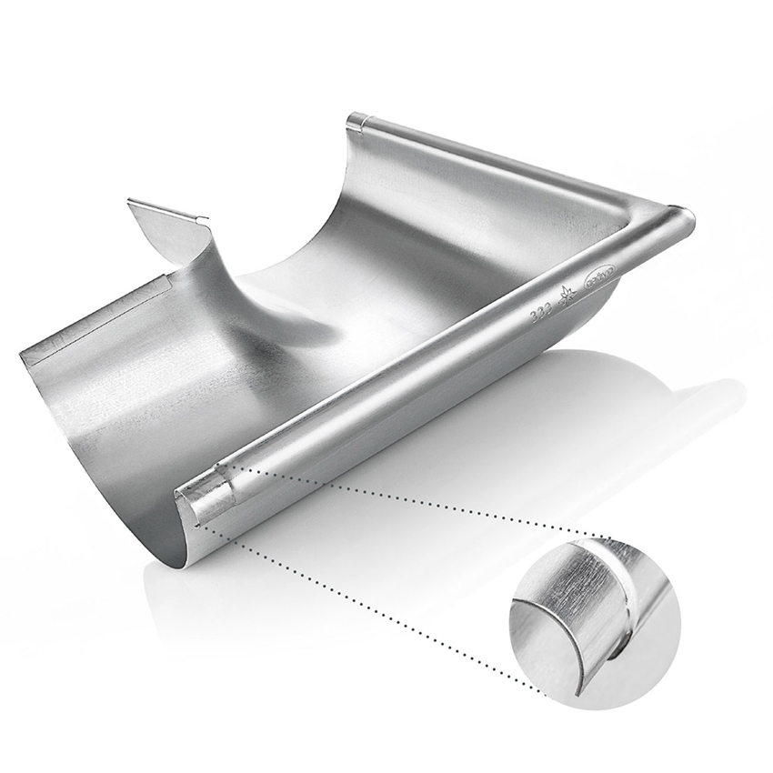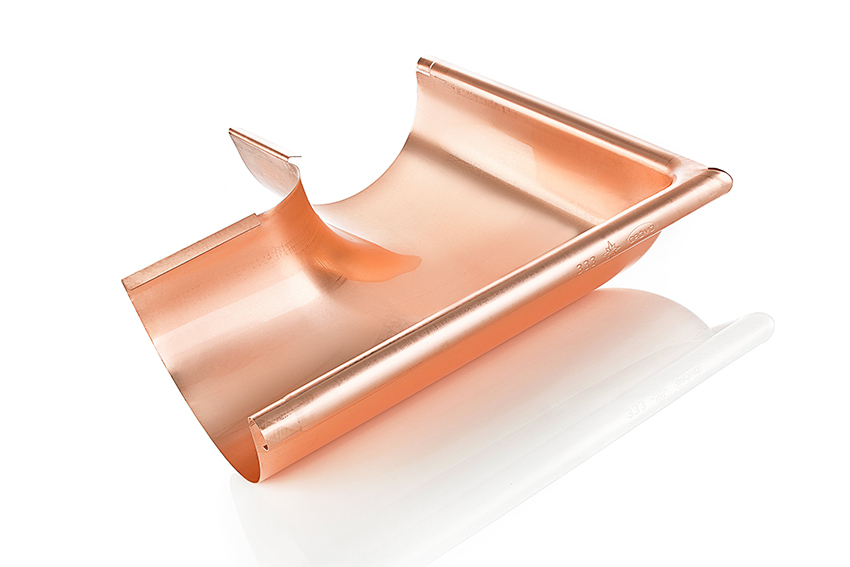 The deep-drawn exterior gutter corner is made from one piece of metal and counterbalances low tolerances on the building. The recessed bead with insertion slot makes installation easier. The seam is perfectly prepared for soldering.