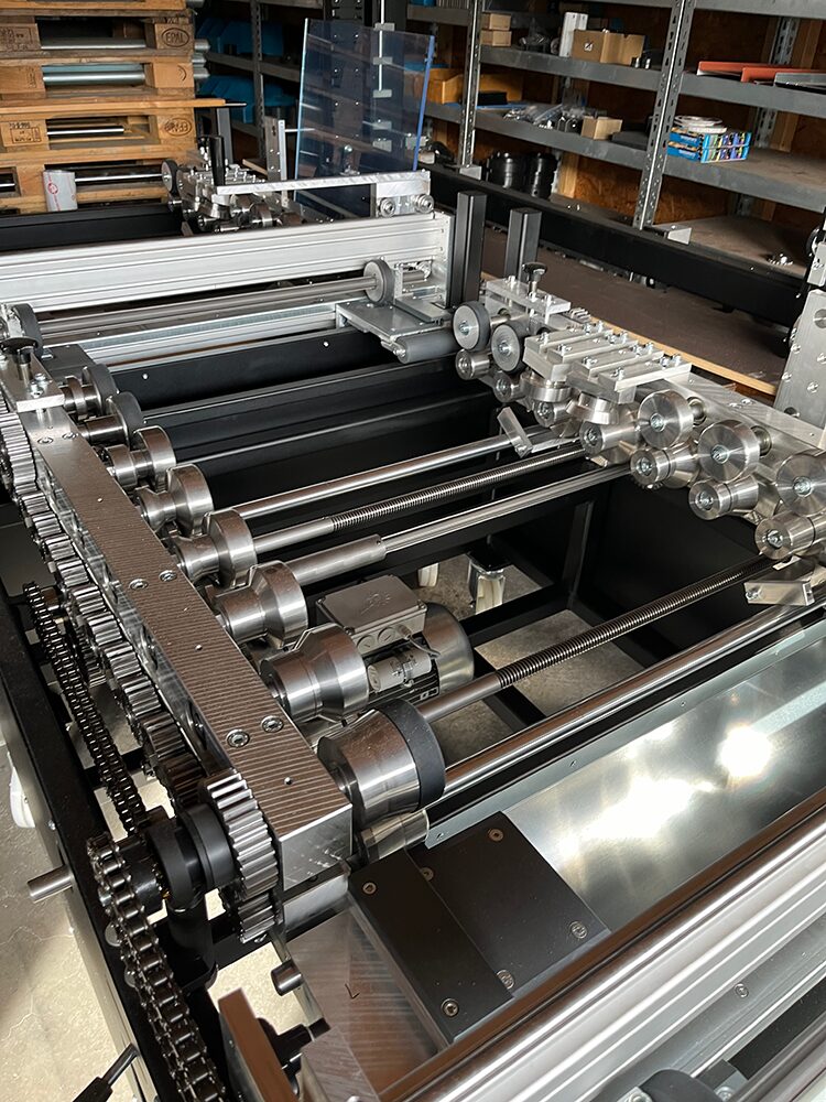 - Sheet width: Infinitely variable adjustment via trapezoidal threaded spindle for a sheet width of 280-820mm