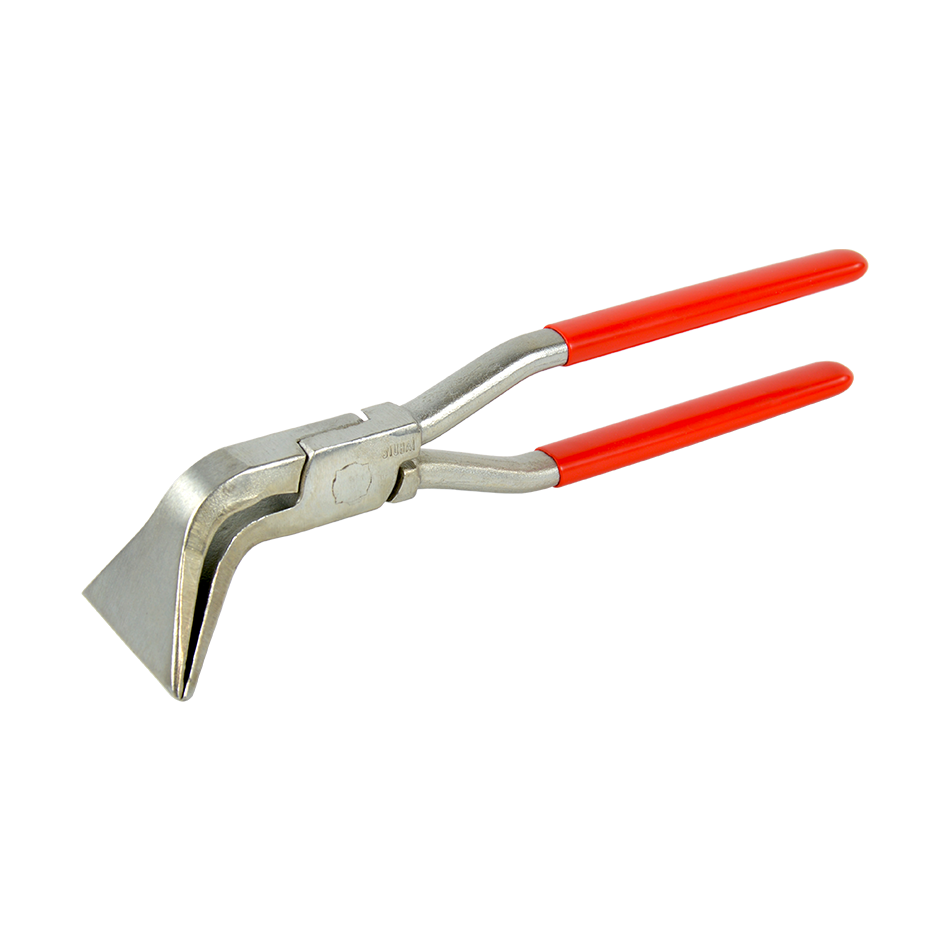 Stubai niro look tinsmith seaming pliers, lap joint, with a 45° bending angle. Forged, with mouth and jaws quenched and tempered, slightly rounded edges, red plastic coated handle