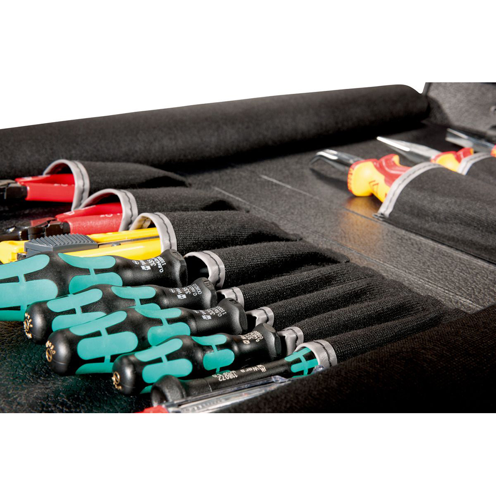 This Parat Basic Tool Wallet can be used either in your workshop or on site with the customer. It provides quick overview of its content and scores with a functional organizing system with 13 pockets. The tools can be easily sorted in and also removed again. As the tool wallet can be completely folded out, it enables quick access to the equipment needed by its owner. The robust material is dust-proof and moisture-resistant; the tools are therefore perfectly protected. A sturdy handle enables easy transport, the centrally placed plug lock can be opened and locked with just one simple movement. Thanks to its handy size, this BASIC tool wallet is extremely versatile.