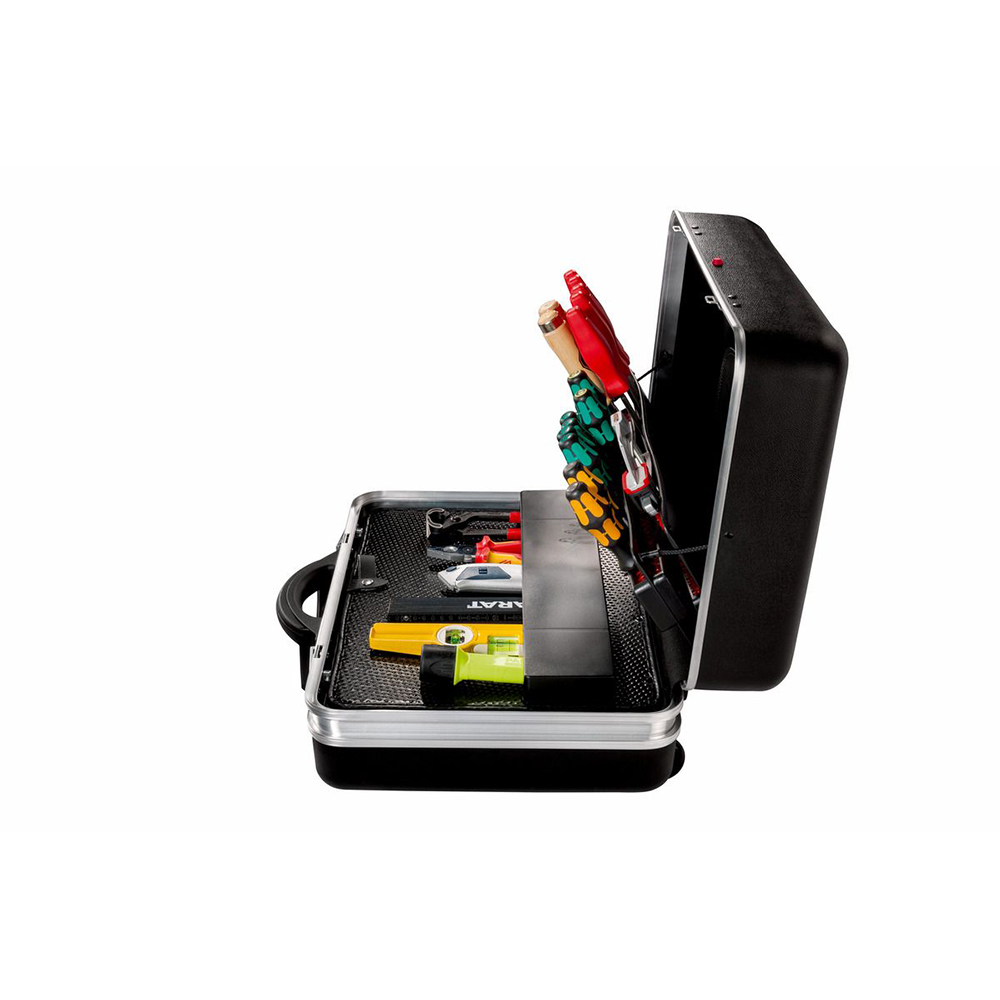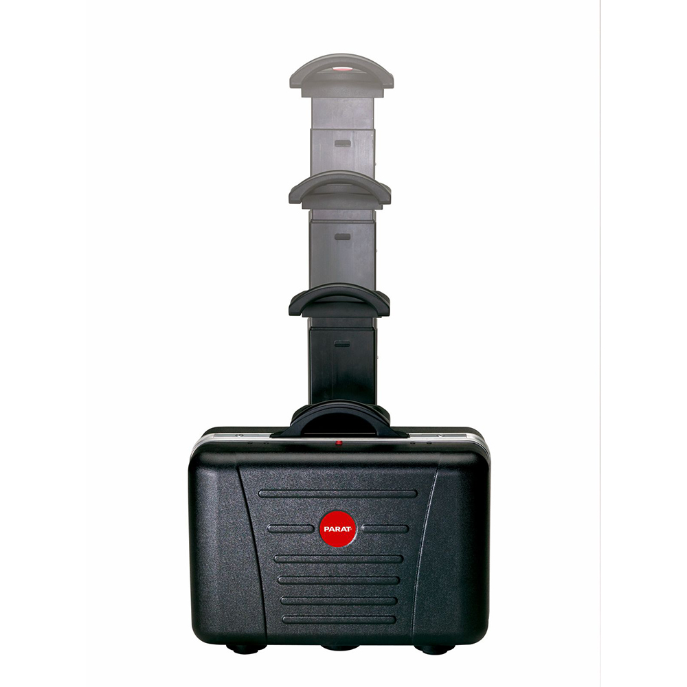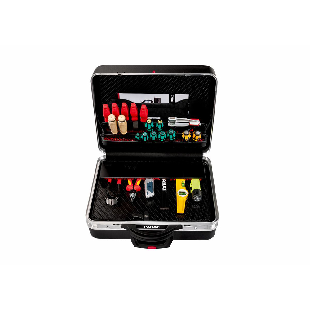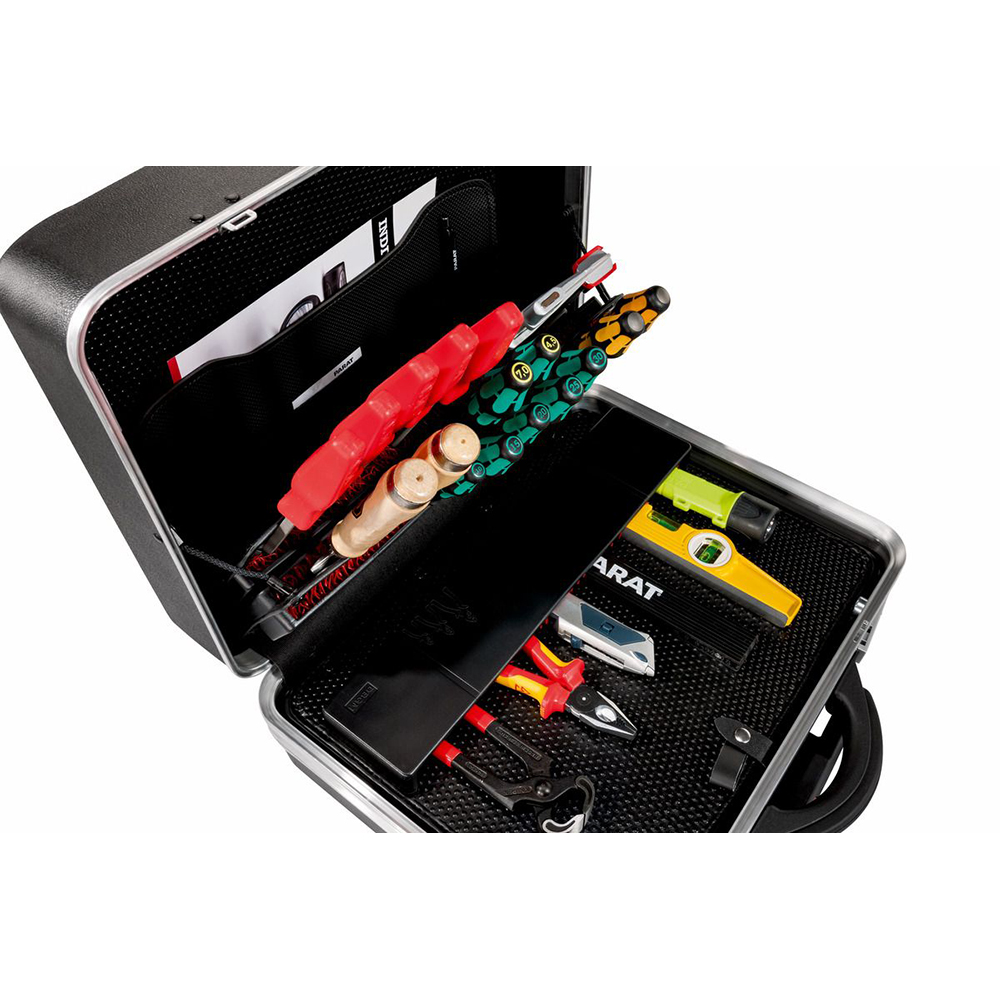 The Parat Classic KingSize Roll CP-7 Tool Case from our bestseller series wows customers as a handy trolley case with enormous capacity and exclusive Parat CP-7 tool holder system. This model has a total capacity of 35 liters and can easily stow away roughly 60 tools. In addition, small parts or bulky tools can be neatly stored in the spacious and freely configurable bottom tray, which is extra deep (88 mm). The clever organizing system with CP-7 tool holder features an impressive and unique clamp concept: tools can be pushed in flexibly and securely stowed away. Bothersome fumbling when pushing tools into sewn pockets is a thing of the past thanks to the CP-7 system. This innovative CP-7 system securely holds your tools in place, even overhead. A generous keep-safe compartment with two business card pockets and two pencil loops is integrated in the case lid. The Classic KingSize Roll CP-7 comes with a case body made of sturdy, anti-slip X-ABS plastic. The integrated castor system with easy-running wheels enables comfortable transport and is thus ideal for all professional craftspeople who need to carry a huge number of tools from one site to the next and, at the same time, attach particular importance to best product quality and high-class workmanship.