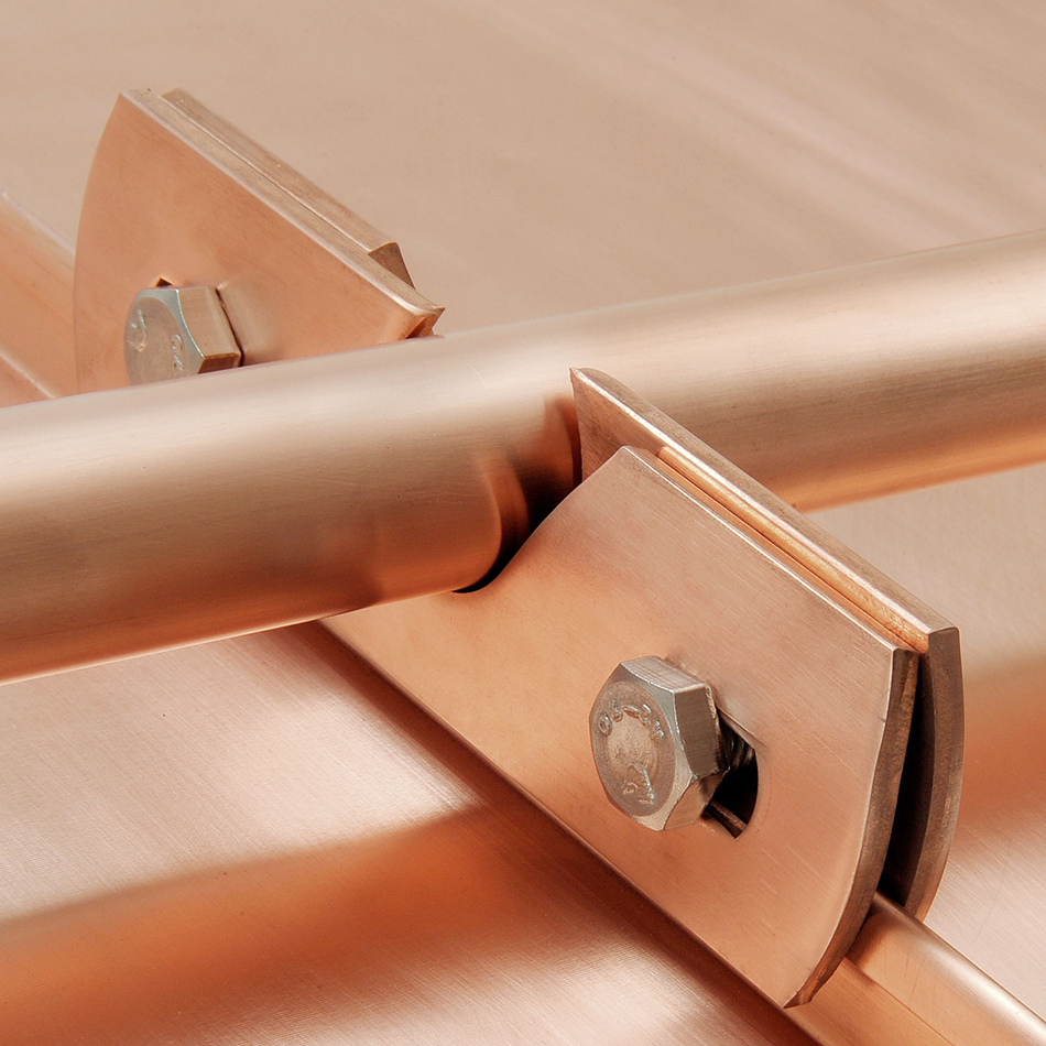 Kling snow retention clamp, copper, with V2A screws suitable for tubes with 32 mm Ø.