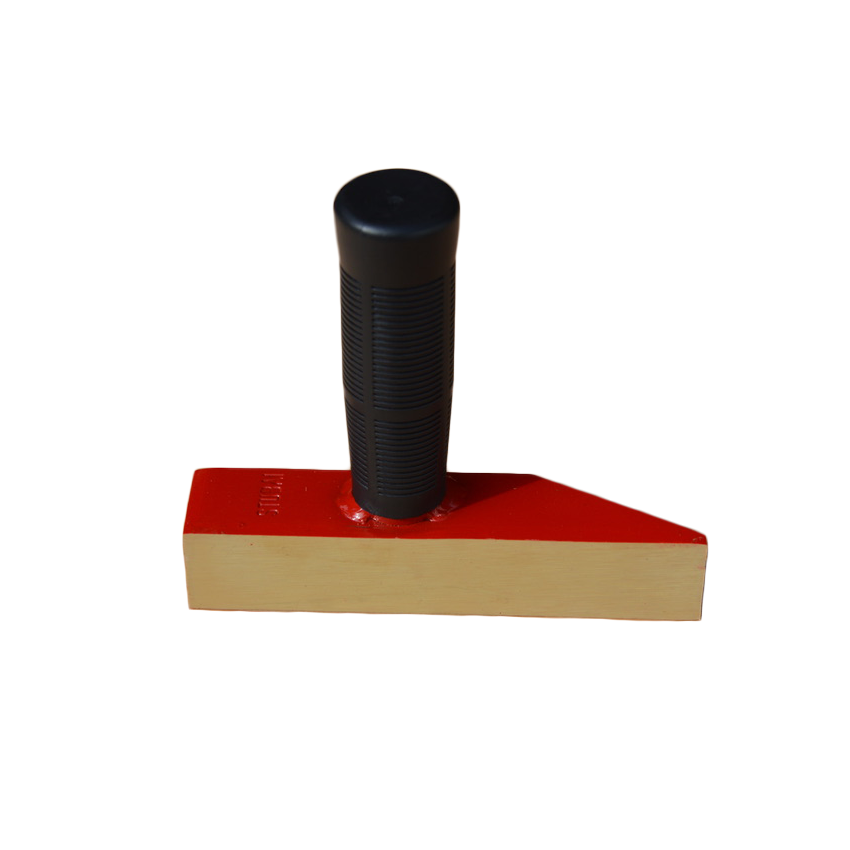 Stubai vulcanized seaming hammer features a yellow vulcanized rubber overlay on three sides of the hammer head. The hammer also has a straight steel handle.