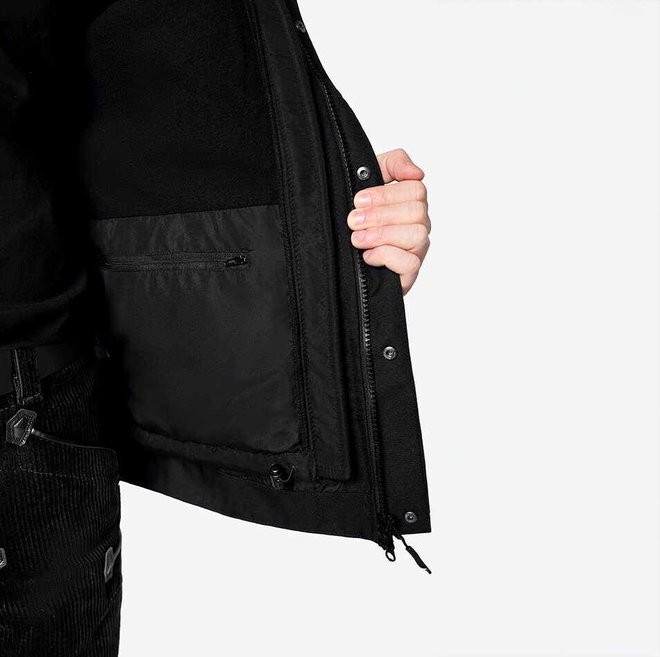 This 2 in 1 wind – and waterproof work jacket has an extremely wear-resistant exterior jacket and a removable micro-fleece interior jacket. The outer jacket is waterproof, windproof, breathable (10,000 mm water column), has sealed seams, dirt-repellent Teflon coating, 4 exterior and interior pockets, extra strong zip fasteners and buttons, and the hood can be stowed in the collar which has reflective strips. The removable micro-fleece interior jacket is made of 100 % polyester in black, anti-pilling, 330 g/sq. m. and has 2 exterior and 2 interior pockets.
