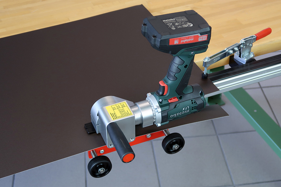 While the existing adjustable guide for flat sheets works just as well for the 1022 there is also a new panel guide to further expand the range of applications. With this guide you can cut your pre-profiled panels to your desired width. The T-nut guide system is offered with movable hold-down clamps with extended reach for fixing your workpiece for cutting and following work steps like using our benders!