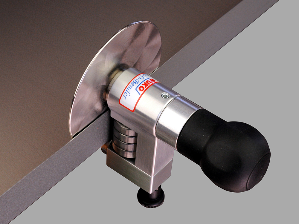 Wuko Disc-O-Bender Maxi Twist 4041 for bending from 90°-180°, and a bending height from 8-40mm. No free space is required at panel edge for setting the tool on and off. Just twist the roller stop by means of the locking bolt, place the tool on the right angle bend, twist the roller stop back and start bending
