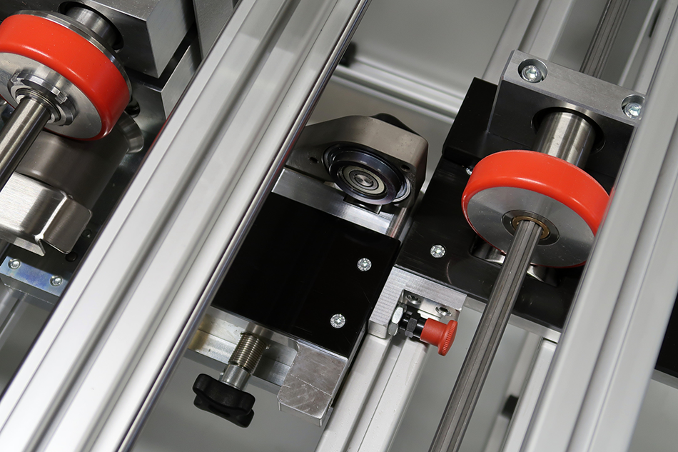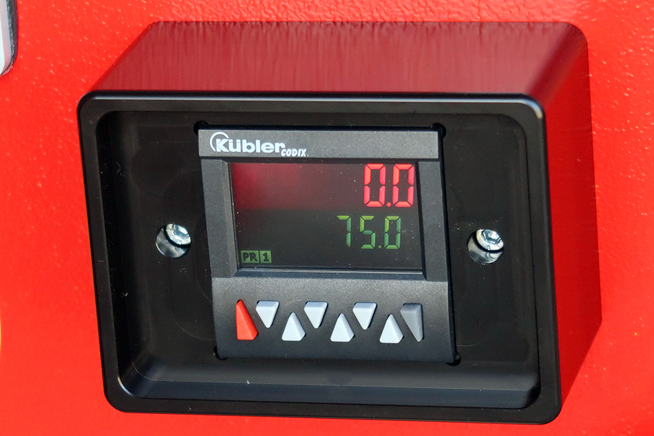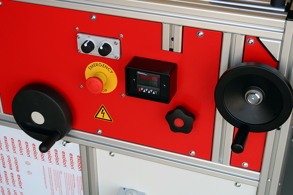 - Electronic preset counter (two-line display) placed on the external control elements panel, with separate encoder and measuring wheel on the inside.
