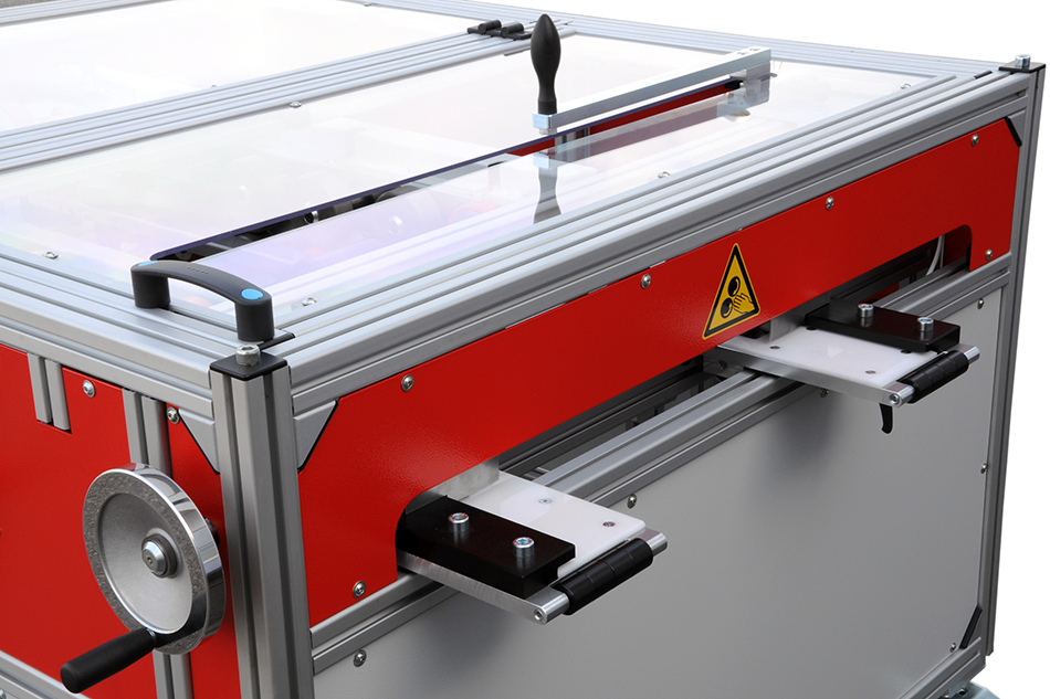 - Upper machine cover: Swing doors, easy to open, with safety switch, frame elements made of transparent, impact-resistant polycarbonate. Clear view during profiling process, easy access for adjustment and service